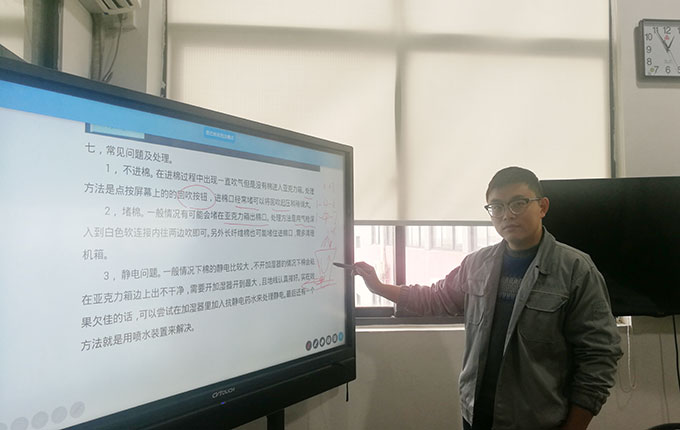 “絨、棉填充一體化,維保方面會(huì)很復(fù)雜嗎?”“PLC原理是怎樣的?”“模塊調(diào)試怎么做?”……帶著一系列的疑問(wèn),10多位來(lái)自武漢、青島、合肥、南通、石獅、東莞等地的代理商技術(shù)人員在上周齊聚常熟,參加了百聯(lián)開(kāi)展的新年首場(chǎng)代理商售后服務(wù)技術(shù)培訓(xùn)。