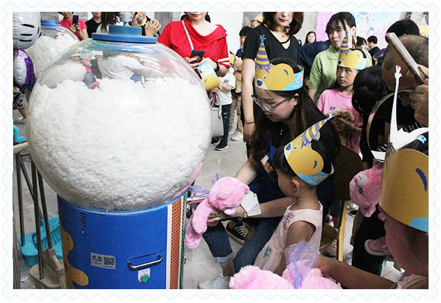 小朋友用爸爸媽媽設計生產(chǎn)的機器給玩偶充棉